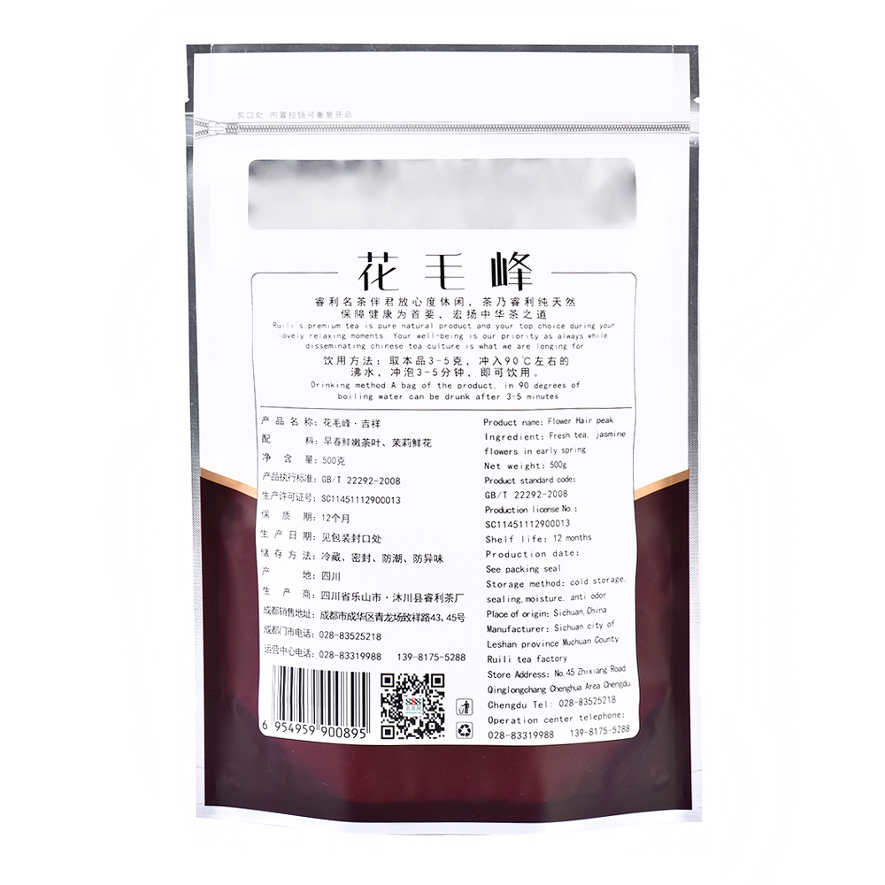 888名茶网-吉祥系花毛峰,食品级自封自立专用包装袋,内置拉链,拉链可重复使用,防潮、防异味,净含量500g。