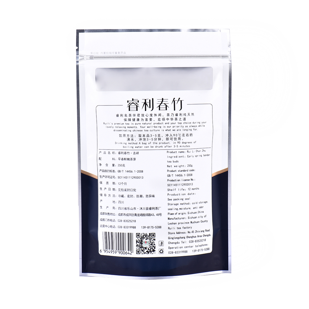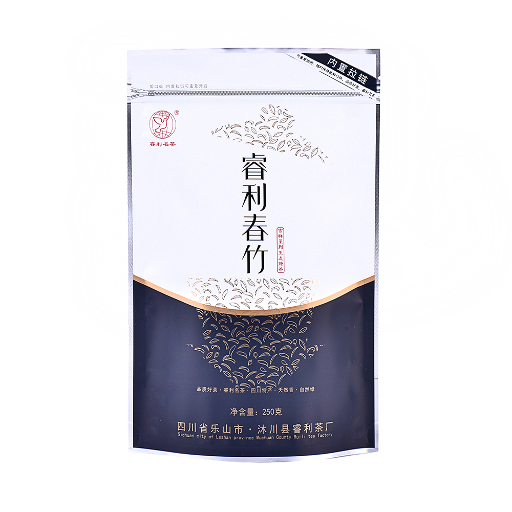 888名茶网-吉祥系列睿利春竹早春明前高山生态绿茶,食品级自封自立专用包装袋,内置拉链,拉链可重复使用,防潮、防异味,净含量250g。
