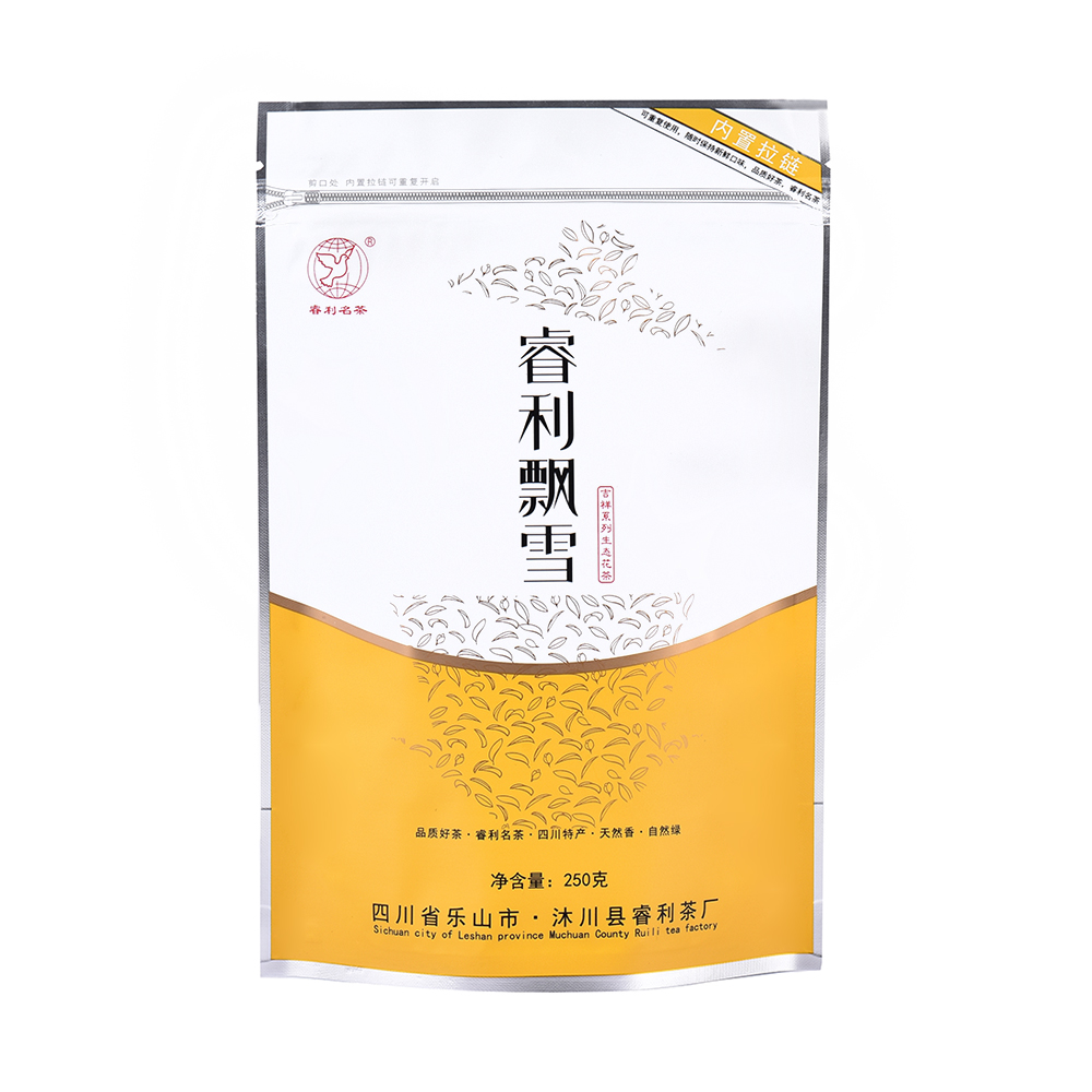 888名茶网-吉祥系睿利飘雪,食品级自封自立专用包装袋,内置拉链,拉链可重复使用,防潮、防异味,净含量250g。