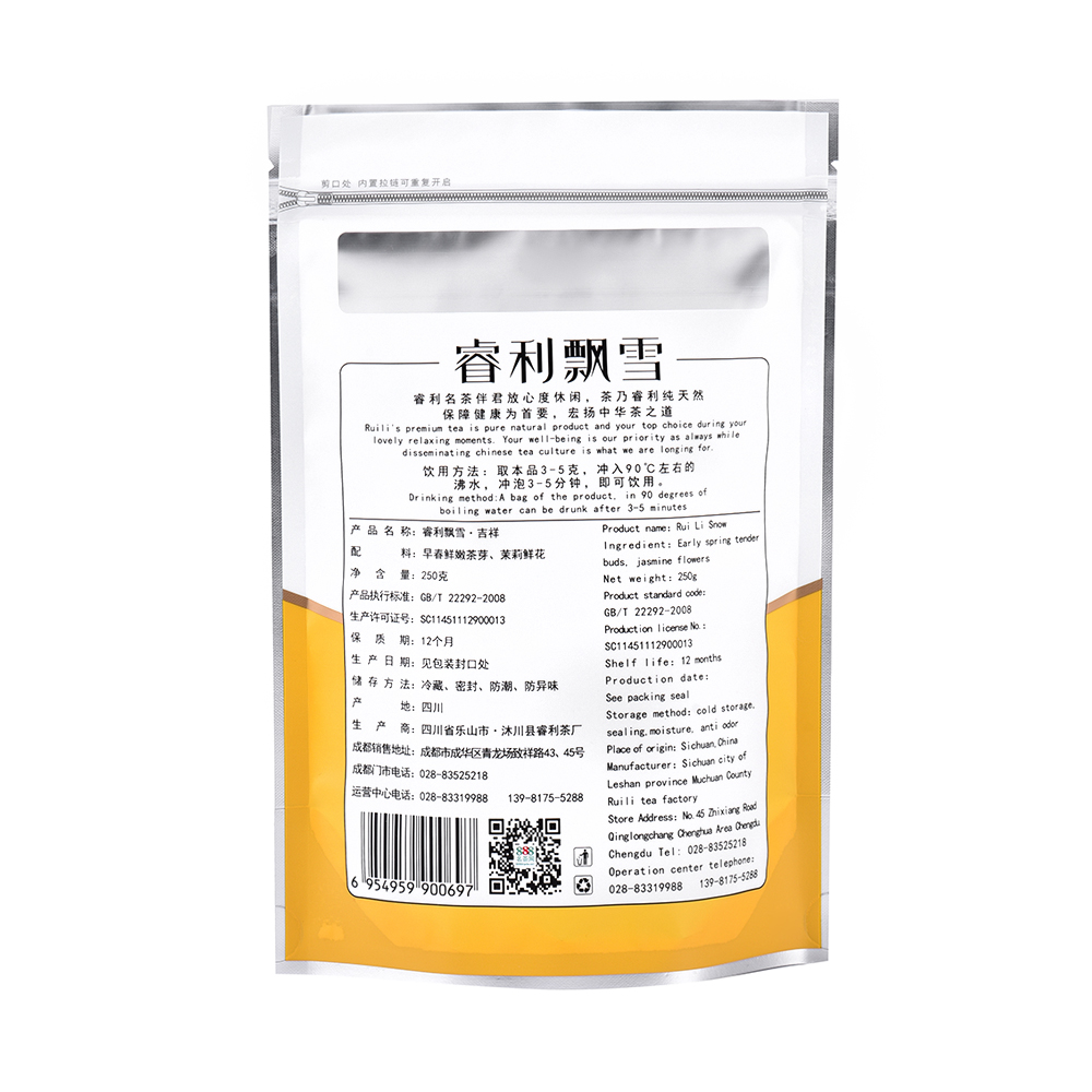 首页 > 飘雪 >睿利飘雪 早春明前高山生态茶叶 三伏天品质茉莉花 醇香浓郁 自封自立袋250克 吉祥系列