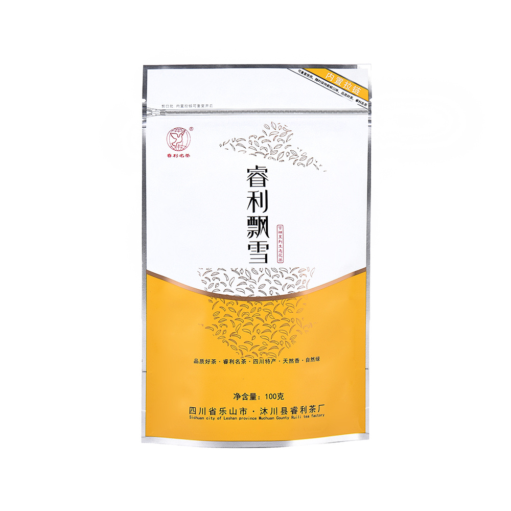 888名茶网-吉祥系睿利飘雪,食品级自封自立专用包装袋,内置拉链,拉链可重复使用,防潮、防异味,净含量100g。