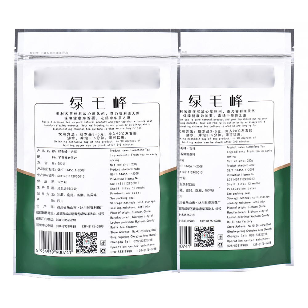 888名茶网-吉祥系绿毛峰,食品级自封自立专用包装袋,内置拉链,拉链可重复使用,防潮、防异味,净含量2×250g。