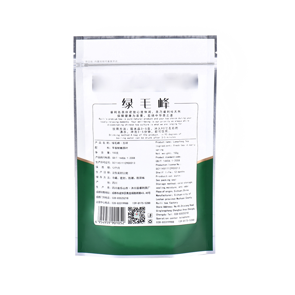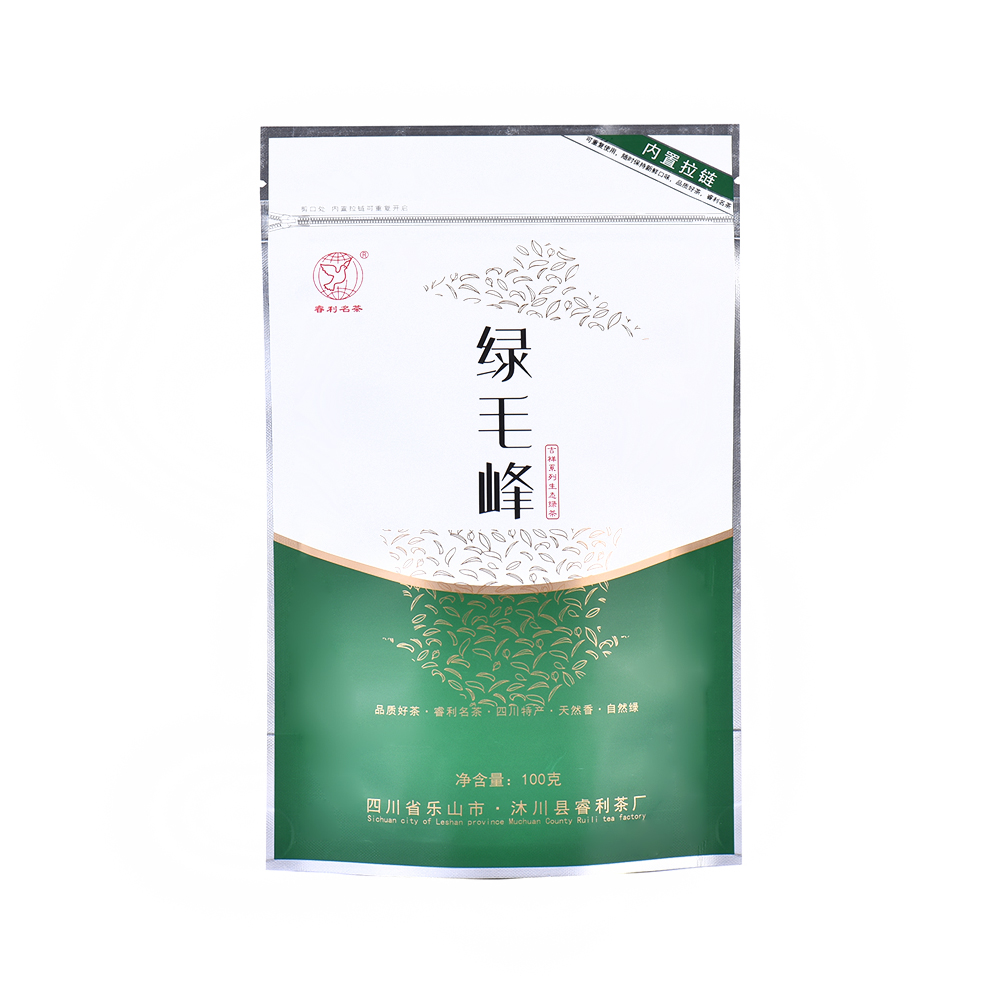 888名茶网-吉祥系绿毛峰,食品级自封自立专用包装袋,内置拉链,拉链可重复使用,防潮、防异味,净含量100g。