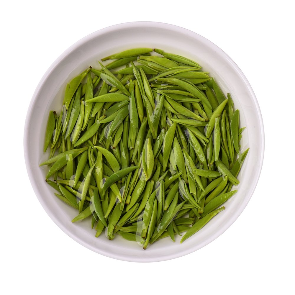 888名茶网-如意系睿利春竹早春明前高山生态绿茶,干茶嫩绿隐翠,形状扁平,呈月牙状,条索紧致,光滑均匀,手工采摘,精工细作,凝练茶形。