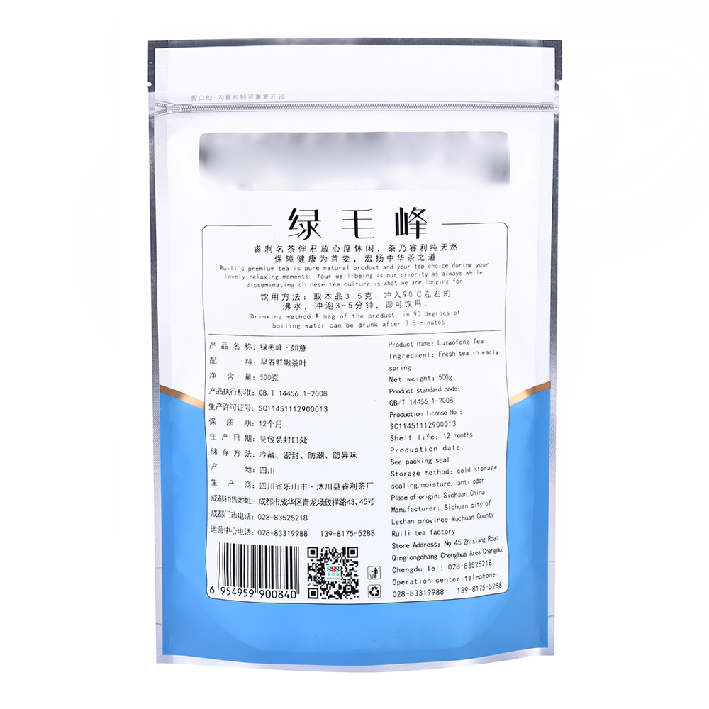 888名茶网食品级自封自立绿毛峰专用包装袋,内置拉链,拉链可重复使用,防潮、防异味,净含量500g。