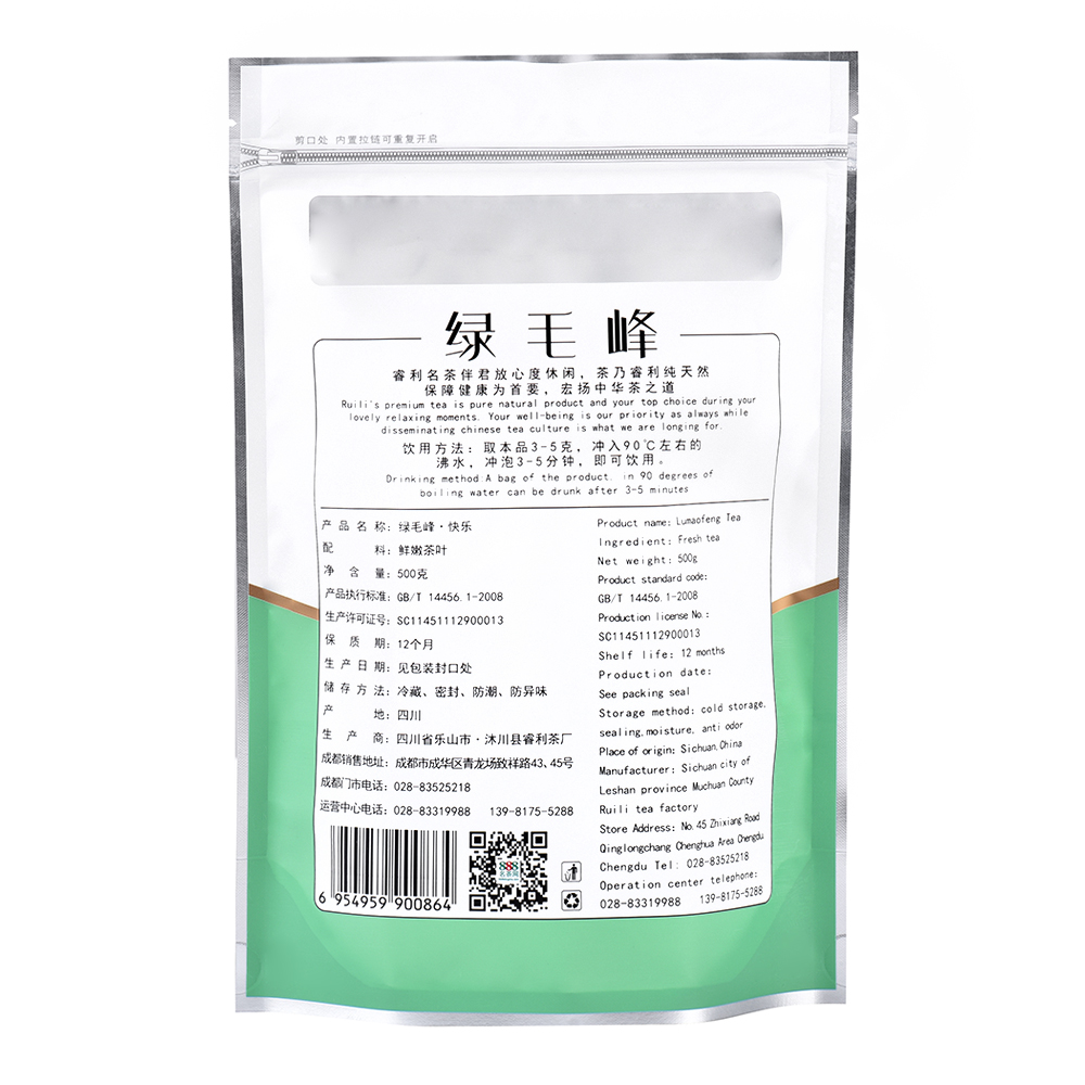 888名茶网-快乐系绿毛峰,食品级自封自立专用包装袋,内置拉链,拉链可重复使用,防潮、防异味,净含量500g。
