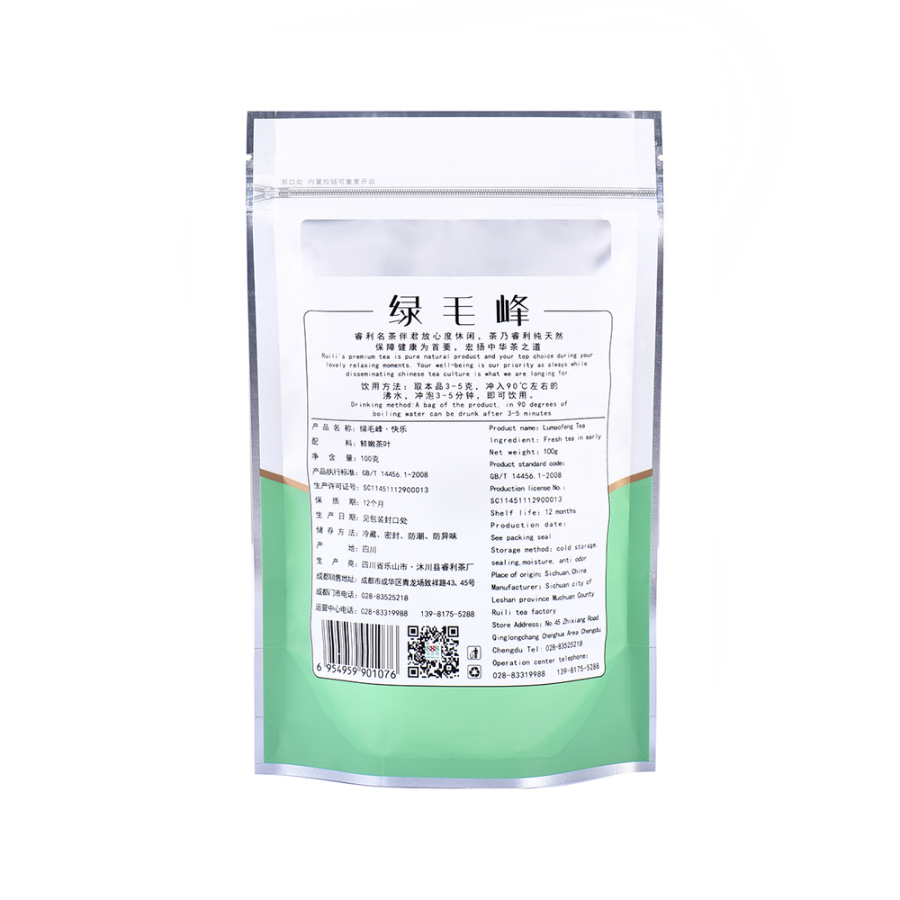 888名茶网-快乐系绿毛峰,食品级自封自立专用包装袋,内置拉链,拉链可重复使用,防潮、防异味,净含量100g。